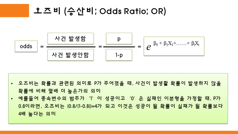 Odds=(사건이 발생함)/(사건 발생안함)으로 나타낼 수 있고, 이것은