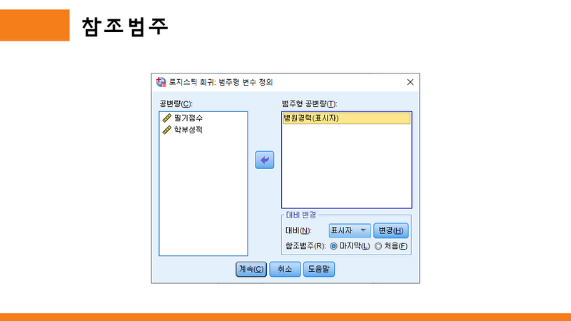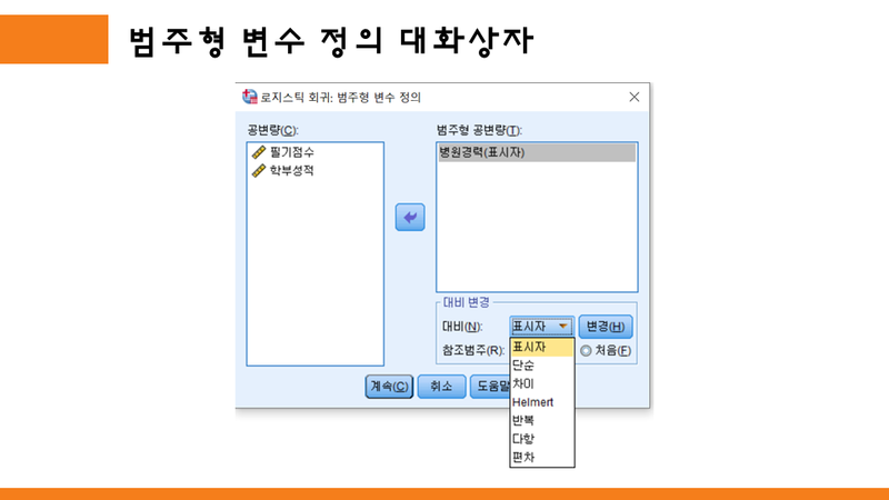 범주형 변수 정의 대화상자는 범주형 변수를 자동으로 더미변수(Dummy Variable)로 변경해주는 역할을 한다. 더미변수를 이용한 다중회귀분석에서는 직접 더미변수를 생성하여 분석에 적용해야 했지만 로지스틱 회귀분석에서는 자동으로 생성해준다.