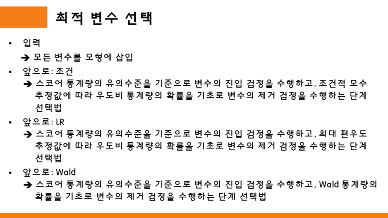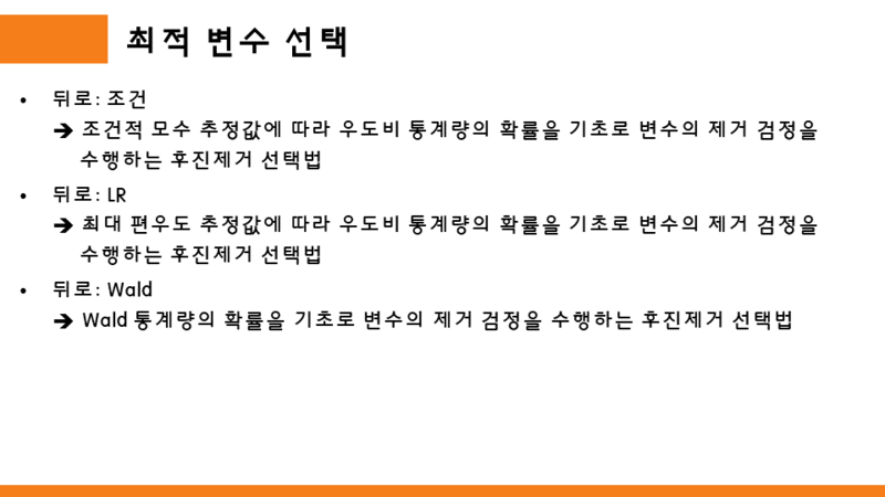 ▶ 최대 편우도 추정값에 따라 우도비 통계량의 확률을 기초로 변수의 제거 검정을 수행하는 후진제거 선택법이다.