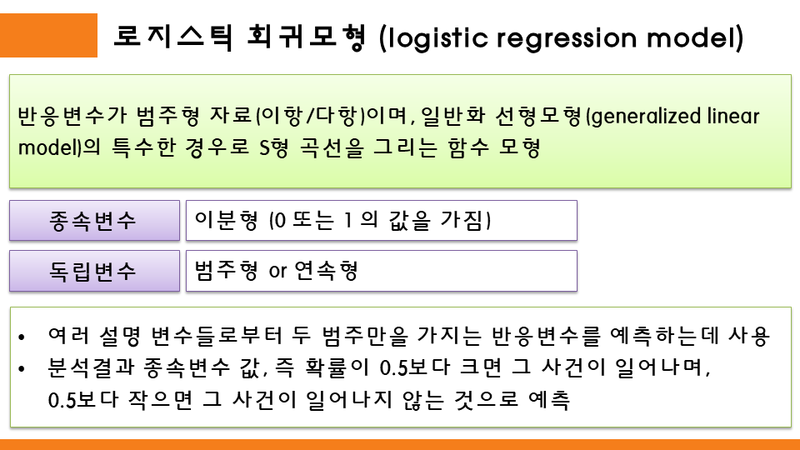 로지스틱 회귀모형은 여러 설명 변수들로부터 두 범주만을 가지는 반응변수를 예측하는데 사용하며, 분석결과 종속변수 값, 즉 확률이 0.5보다 크면 그 사건이 일어나며, 0.5보다 작으면 그 사건이 일어나지 않는 것으로 예측한다.