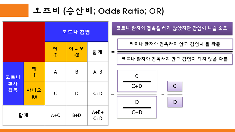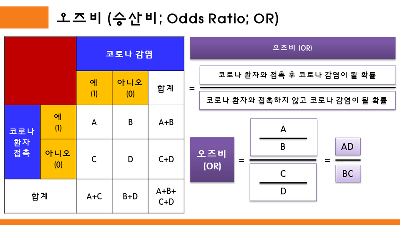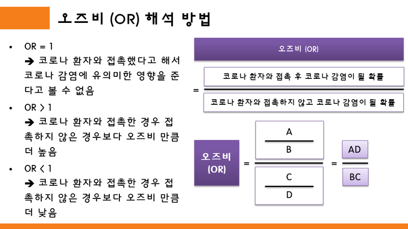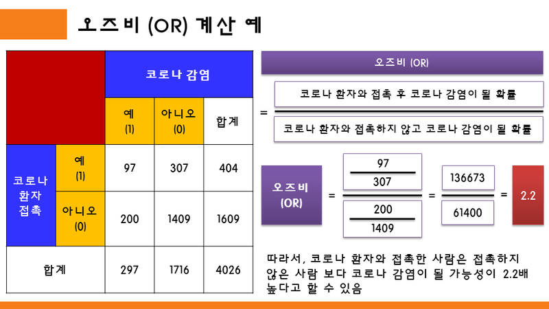 OR > 1 ▶ 코로나 환자와 접촉한 경우 접촉하지 않은 경우보다 오즈비 만큼 더 높게 나타날 것이다.