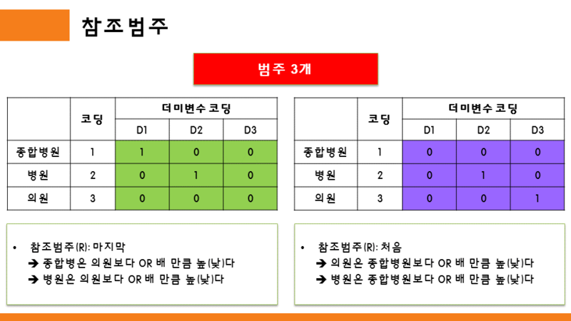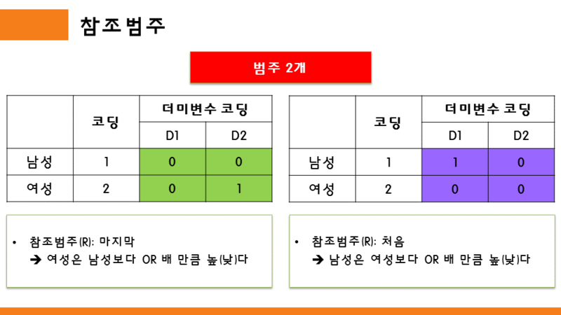 성별이라는 범주형 변수가 있을 때, 일반적 코딩은 남성=1, 여성=1로 코딩하지만 더미변수로 코딩할 때는 참조하고자 하는 변수 설정, 다시 말해서 레퍼런스 변수를 무엇으로 설정하느냐에 따라 해석이 달라진다.
