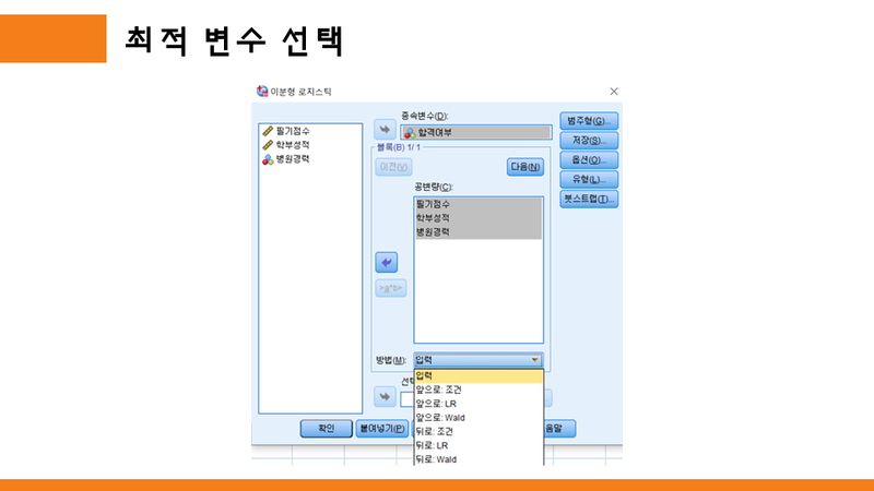 최적의 변수를 선택하기 위한 방법으로 다중회귀분석에도 동시입력과 단계선택 방법 외에 전진, 제거, 후진 등의 방법을 제공하는 것과 같이 로지스틱 회귀분석에도 7가지의 방법들을 제공하고 있다.
