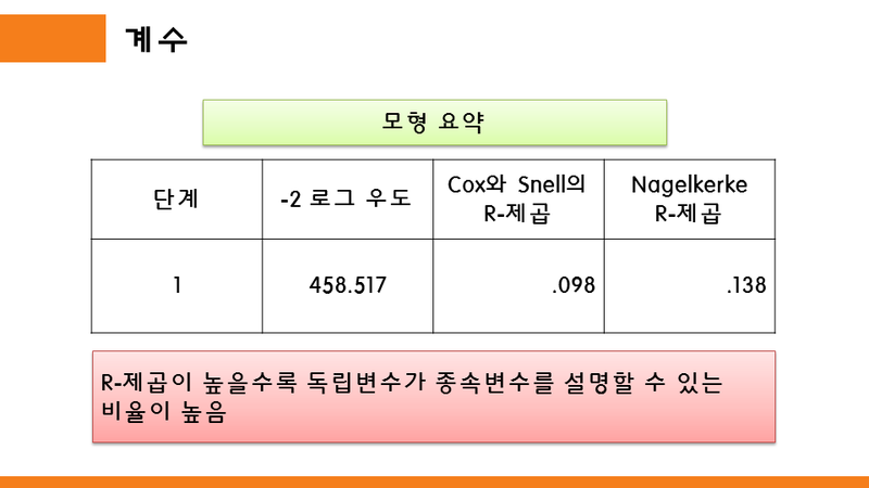 모형요약 표에는 모형 설명력을 위해 -2 로그우도, Cox와 Snee의 R-제곱, Nagelkerke R-제곱의 3가지를 제공한다.