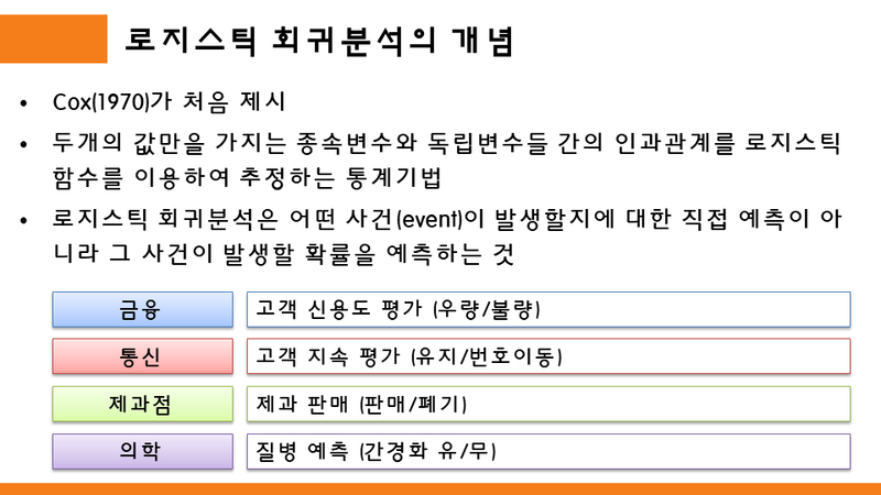 Cox(1970)가 처음 제시한 개념으로 두개의 값만을 가지는 종속변수와 독립변수들 간의 인과관계를 로지스틱 함수를 이용하여 추정하는 통계기법이다.