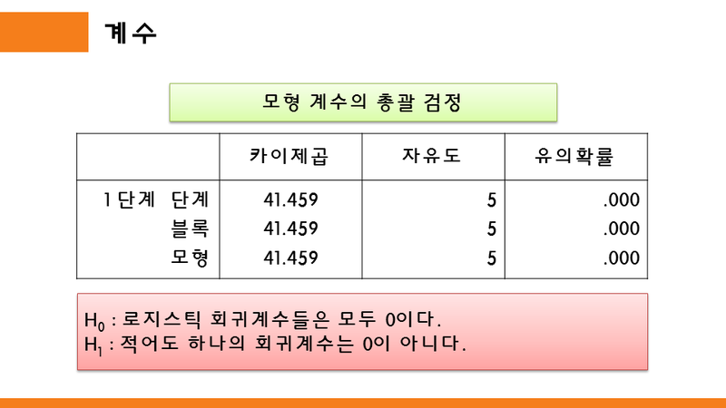 계수에 대한 검정으로는 Wald 통계량을 활용하고, 논문에는 (Wald=000000, P<0.05)와 같이 표기한다.