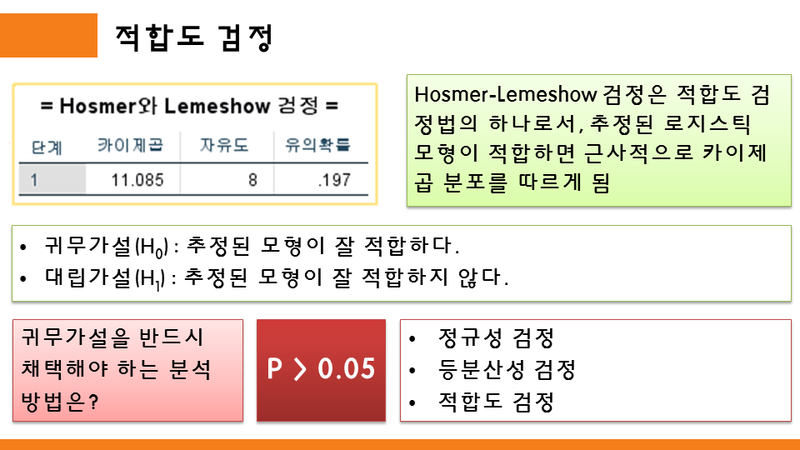 로지스틱 회귀분석 모형의 적합도는 Hosmerㅇ와 Lemeshow 검정 표를 활용한다.