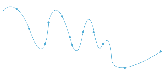 각 점들은 학습 데이터, 선은 머신러닝이 생성한 모델이라고 볼 수 있다. 이 모델은 개별 점들을 하나도 놓치고 싶지 않아서, 이 현상을 어떻게든 완벽하게 설명하고 싶어서 요리조리 따라가며 선을 그리고 있다. (이게 바로 오버피팅 된 거다.)