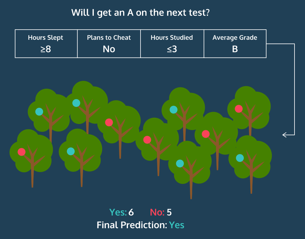 (“무작위 숲”이라는 이름처럼) 랜덤 포레스트는 훈련을 통해 구성해놓은 다수의 나무들로부터 분류 결과를 취합해서 결론을 얻는, 일종의 인기 투표(?) 같은 거다.