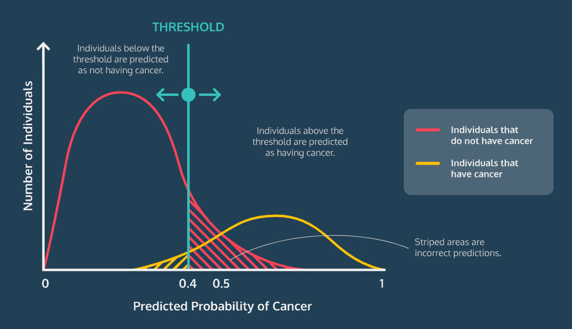 다만, 필요에 따라 모델의 임계값을 변경할 수 있다. 예를 들어, 암을 진단하는 로지스틱 회귀 모델을 작성하는 경우에는 혹시 모를 경우에 대비하여 좀 더 민감하게 확인하기 위해 0.3이나 0.4로 임계값을 낮춰 모델의 민감도를 높일 필요가 있다. 그래야 전체적으로 오분류가 더 많아지더라도 실제 암 환자를 놓치는 사례는 적어질 테니까.