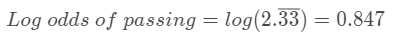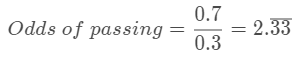 사건이 발생할 확률을 발생하지 하지 않을 확률로 나눈 값이 odds다. 그래서 만약 학생이 0.7 확률로 시험에 합격한다면, 당연히 시험에서 떨어질 확률은 0.3이 되니까 이렇게 계산할 수 있겠다.