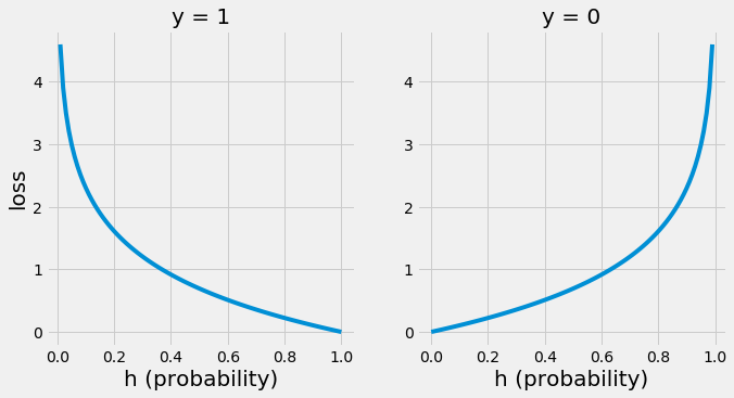 결국 분류(레이블)가 y=1, y=0 일 때 각각의 손실 함수를 그래프로 나타내면 아래와 같다.
